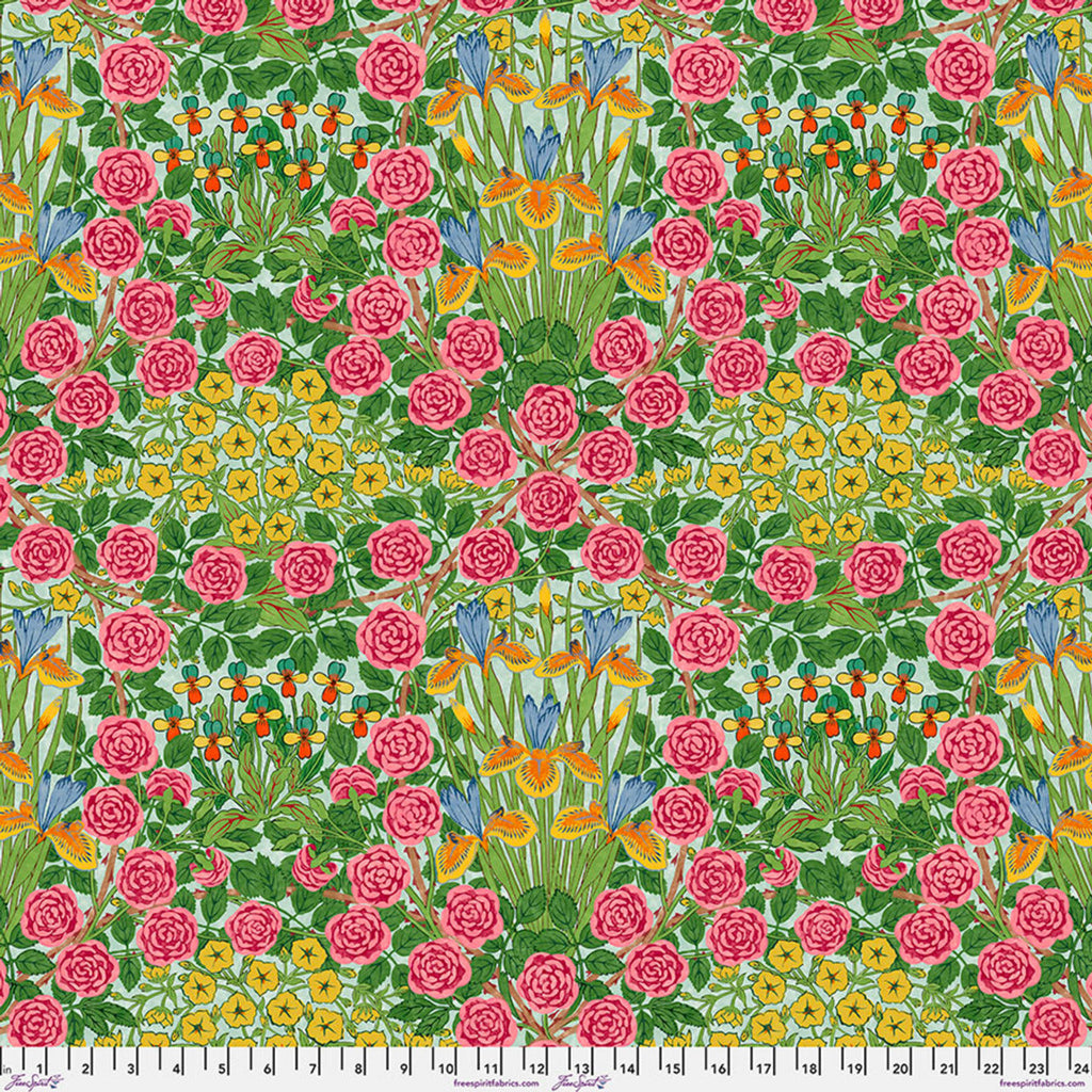 **Please allow for up to 8% shrinkage in the width.  Pre-washing is recommended in cold water and a cool dryer** 108" wide 100% cotton quilt backing fabric in the Bedford Park Collection in the Campanula design from The Original Morris & Co. for FreeSpirit Fabrics in the color "Seaglass" SKU # QBWM001.SEAGLASS. This print is directional and runs the length of the fabric (perpendicular to the selvage).  Perfectly seamless for the BackSide of your quilts and other projects!