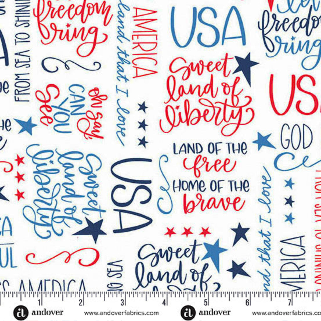 **Please allow for up to 8% shrinkage in the width.  Pre-washing is recommended in cold water and a cool dryer**  108 inch wide 100% cotton quilt backing fabric in the Land That I Love pattern from the Oh Say Can You Sew Collection designed by Amy Latta for Andover Fabrics in the color "White" SKU#AW-10062-L. This patriotic print is perfectly seamless for the BackSide of your quilt and other projects!